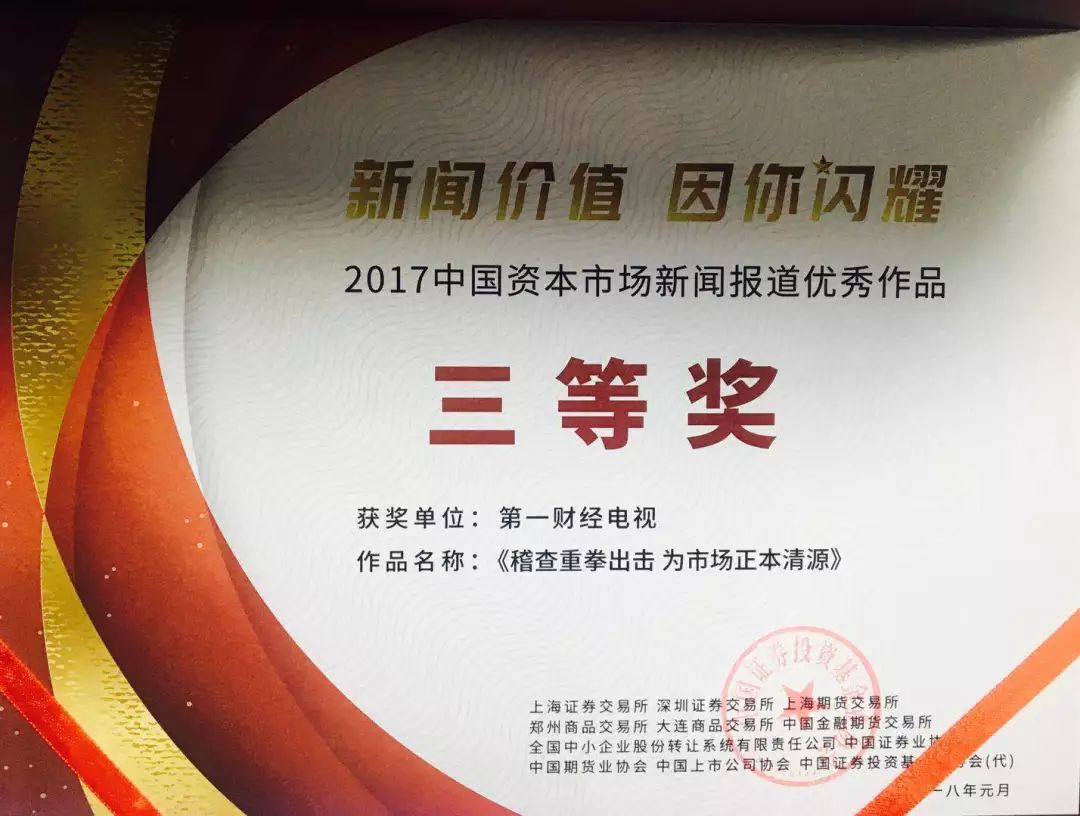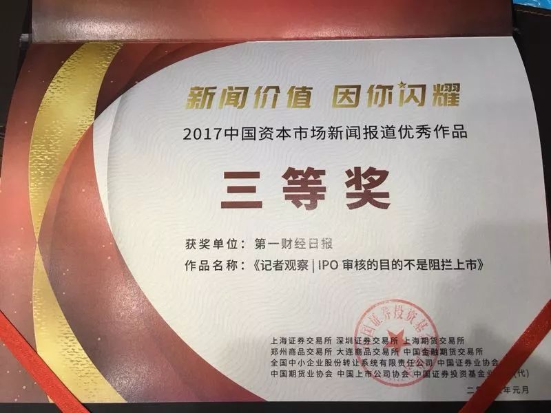 第一财经选送的三件作品获奖,其中一件作品获得一等奖、两件作品获得三等奖,彰显了第一财经在资本市场新闻报道方面的专业度和影响力。这三篇作品分别是:《并购重组市场悄然升温 开启存量资产优化时代》(一等奖;作者:周楠)、《记者观察 | IPO审核的目的不是阻拦上市》(三等奖;作者:杜卿卿)、《稽查重拳出击 为市场正本清源》(三等奖;作者:沈旭、袁玉立)。