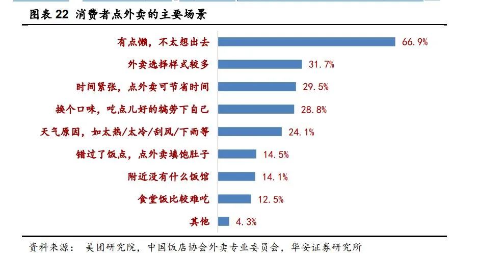 有66.9%的消费者因为“有点儿懒,不太想出去”而选择点外卖,29.5%的消费者认为“时间紧张,点外卖可节省时间”。