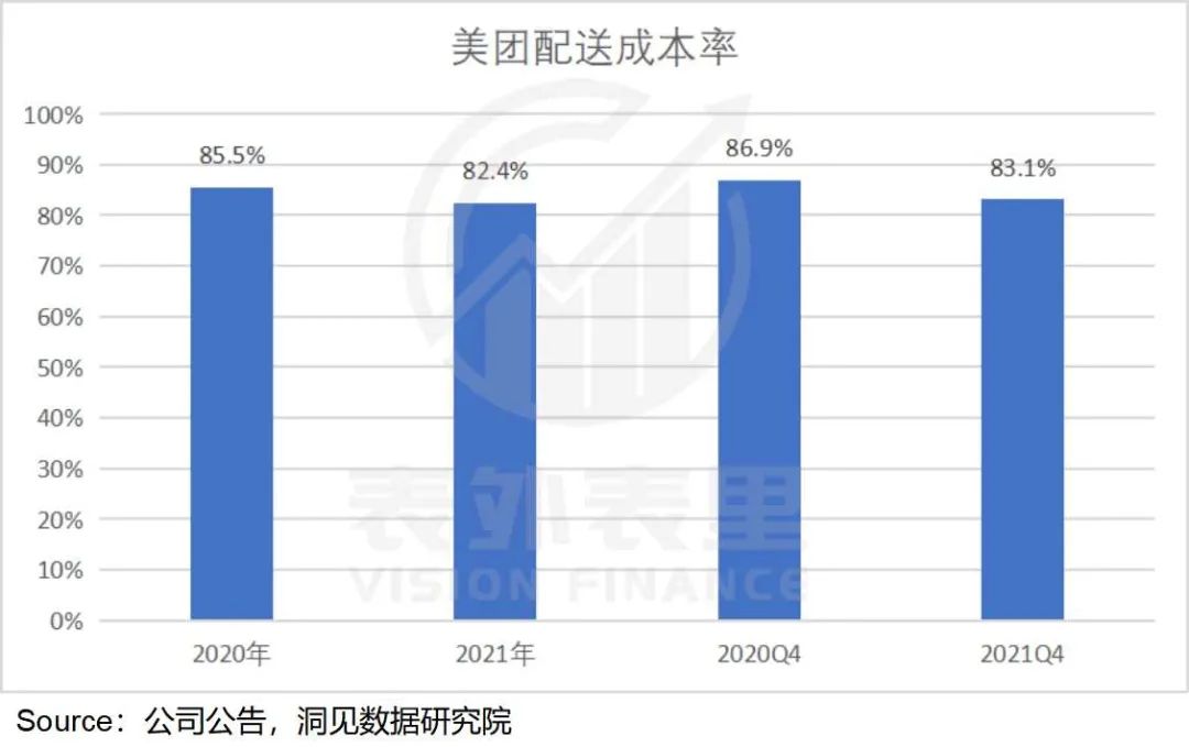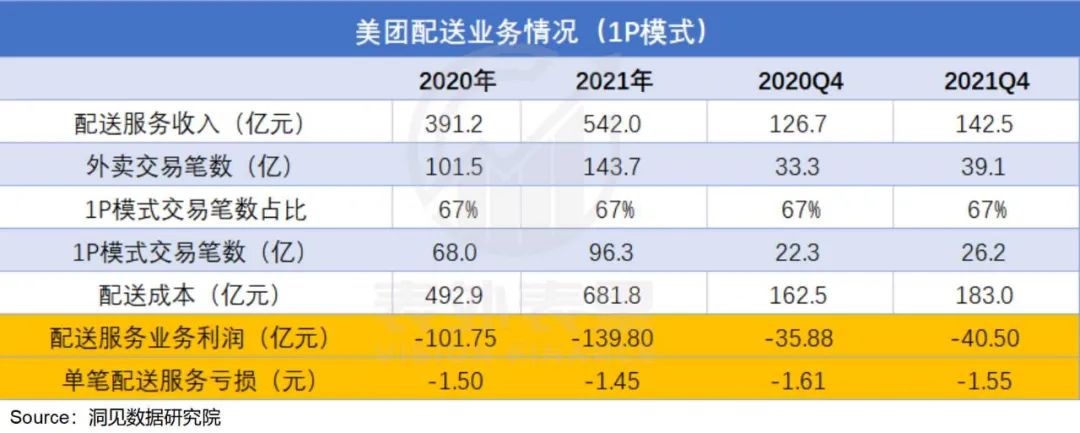 而从数据上看,配送服务收入占餐饮外卖总收入的大头,2021Q4占比为54.6%,收入约为143亿。