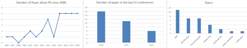 正是基于这个矛盾点,针对 RS 相机在 CV 领域的研究越来越多。从 06 年 ECCV 上一篇关于 RS 的文章拿了 Honorable Mention Award 开始,到今年的 ECCV 为止,共有 33 篇关于 RS 的文章发表在 CVPR/ICCCV/ECCV 上,分别涉及 SfM、Pose Estimation 和 Rectification 等 7 大主题。