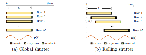 这就牵扯出了关于 RS ego-motion 模型的假设。如果我们假设相片中的每一行都有一个独立的 pose,那么 n 行的照片就得求解 6n 个参数,这显然是不可能实现的。有一个很好的解决方法是,为快门时间内相机的 ego-motion 设计动力学模型,这就相当于给每一行的 pose 之间设计了时空上的联系,从而有效地降低了要求解得参数个数。