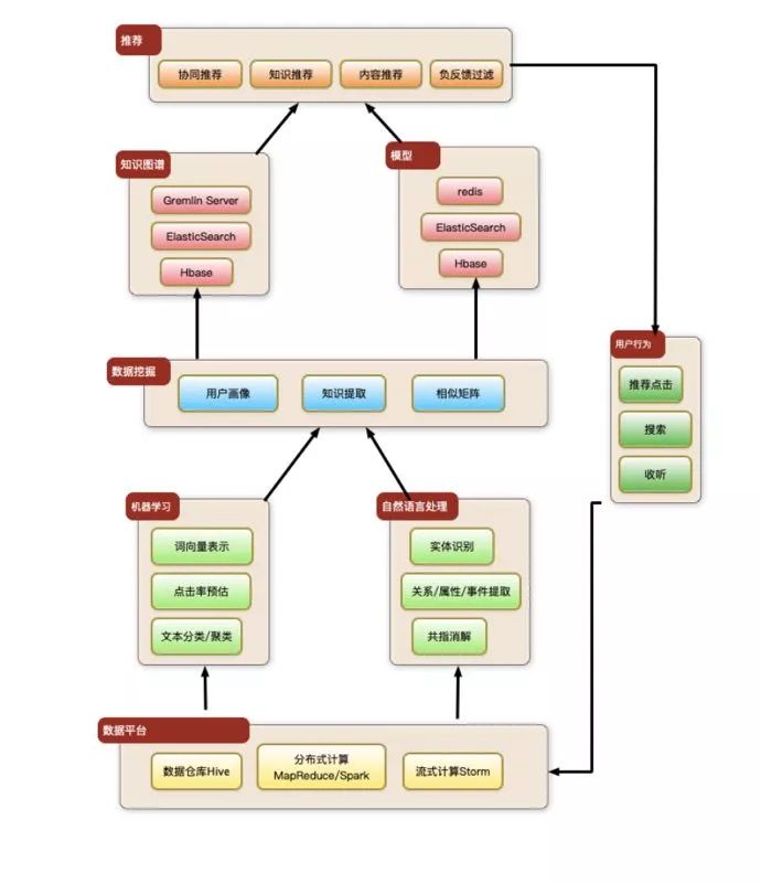 我们的推荐架构从底层到上层,分为数据平台、数据挖掘和推荐投放。
