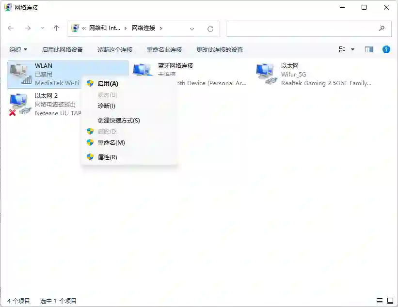 除了服务可能因为某种原因异常关闭,硬件本身也可能被意外禁用。比如有时在调整 Wi-Fi 开关后出现的消失 bug,有可能就是整个无线网功能一起被 Windows 错误禁用了。可以在控制面板中找到网络和共享中心,在更改适配器设置中查看是否有硬件功能禁用。也可以禁用异常的硬件,重启电脑后再启用,看是否恢复正常。