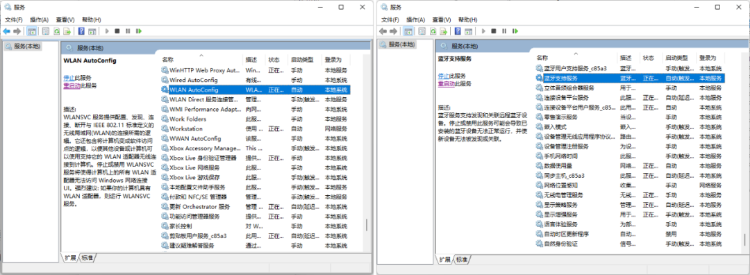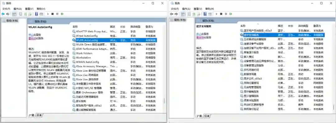 你可以通过 Windows+R 打开「运行」,输入 services.msc,或直接在 Windows 搜索查找「服务」,找到「蓝牙支持服务」或「WLAN AutoConfig」。默认情况下,它们应当处于手动启动、正在运行的状态。