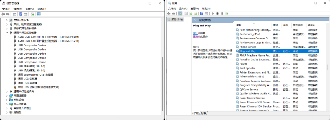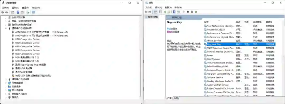 除此之外,我在某一次状况中遇到了如下图所示的状况:蓝牙从设备管理器中直接消失,反而多出了一个未知 USB 设备。出现这种状况时,可以尝试直接卸载问题设备,重启后有一定几率恢复。也可以尝试在服务中寻找 Plug and Play 服务重新启动,再卸载异常的设备,重启电脑后有一定几率正常识别设备。