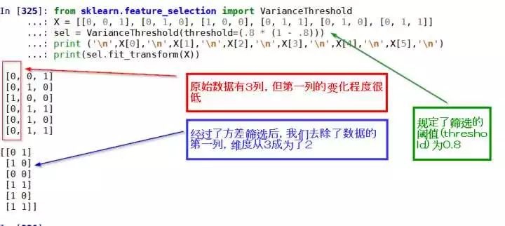 如上图所示,此处所调用的 Sklearn 的 API 还有一个作用就是自动移除单一取值的数据,一举两得。