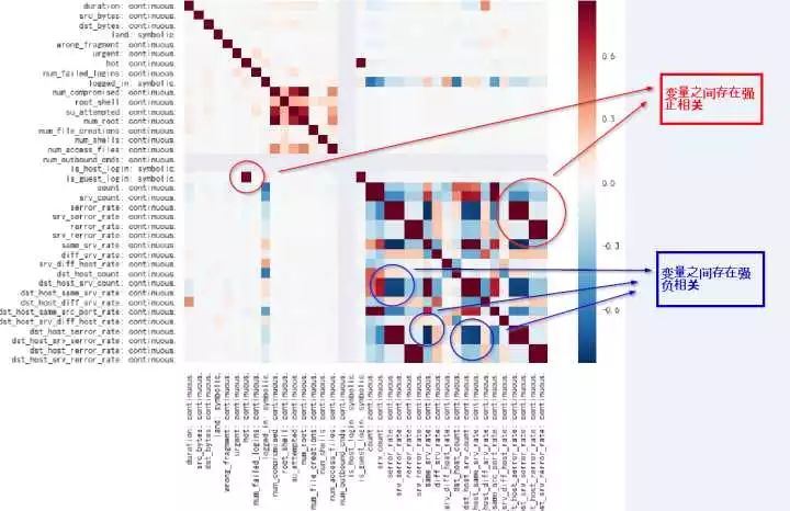 计算变量之间的相关性可以得到一个矩阵,用于描述每两个变量这件的相关性 (-1 代表负相关,0 代表无关,1 代表正相关)。在可视化后 KDD99 数据的相关性图谱后可得到下图。