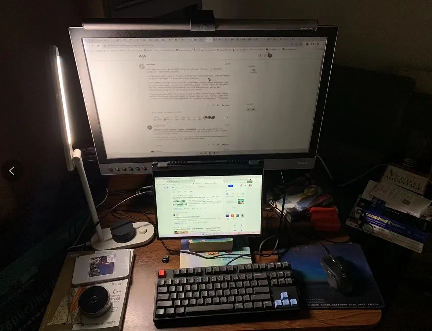 无论是上面的还是下面的屏幕都不反光,看的很清楚,简直太棒了~看代码打游戏啥的没有任何问题,感觉普通屏幕,使用挂灯,让周围环境光充足起来,这样眼睛就不会太容易疲劳了。毕竟算是生产力了,屏幕挂灯用了就不会回去了。这篇就讲这么多吧,下一篇就还是大家熟悉的技术文了~