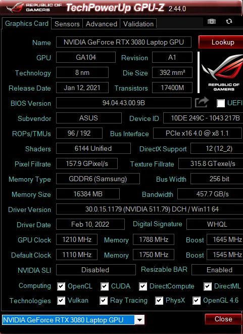 毕竟搞AI的,当然对GPU比较敏感,这个3050TI是基于GA107核心,有2560个CUDA Core,80个Tensor Core,基本是够玩了。计算能力8.6,目前(这句话写的时候还是最新,但是立马老黄3月份推出了H100)最新的特性该有的都有: