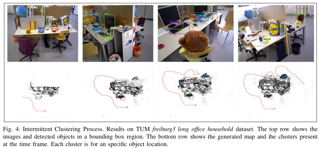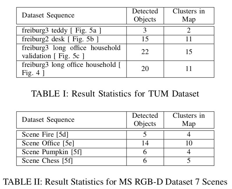 在这过程中,一个主要的困难在于对一段时间内检测到的物体的数据关联。作者展示了一种无参数的统计方法来解决连续帧中被检测到的物体的数据关联问题。随后作者使用了一种无监督聚类方法来识别物体是否存在于地图之中。整个这个线程可以与SLAM平行运行。