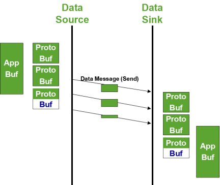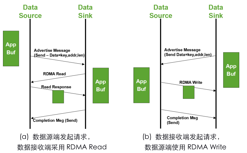 如图7所示,使用双边操作(SEND/RECV)传输数据与传统Socket网络传输类似,发送端使用RDMA SEND发送数据,接收端使用RDMA RECV接收数据。但是在发送端发起RDMA SEND操作之前,接收端需要准备好接收数据的内存区并发起RDMA RECV操作,否则就会发送失败。因此双方需要约定一次传输最大的数据大小,一般在在创建RDMA连接时协商,接收端以该大小准备接收内存区,发送端以该大小对大请求进行切分。使用双边RDMA SEND/RECV的限制在于当请求小于约定大小时存在接收端内存浪费的现象,而请求大于约定大小时需要发送端切分多次传输并在接收端重组,并且通常需要应用Buffer到RDMA协议Buffer之间的内存拷贝,增加了开销和延迟。