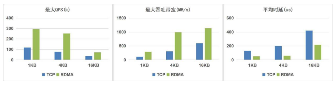 从上面的测试结果看到,在包含有实际业务的测试中,RDMA的表现并没有原始的RDMA测试表现那么优异,我们分析了其主要原因是线程切换、数据复制等操作以及IO路径上其它模块引入了额外的开销。