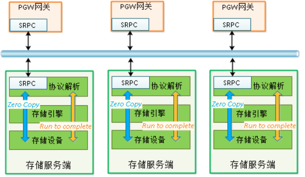 前端PGW请求发送和回调、存储服务端请求处理采用run to complete的方式在同一线程完成,极大地提高单个请求的处理速度,并采用无锁化编程的方式启用多个线程分组处理请求,达到请求的高并发。此外设计了统一的数据缓存管理机制,整个请求处理过程从数据经RDMA接收后,经过各模块处理,再到通过RDMA发送出去,全程不需要对数据进行内存拷贝,进一步减少系统开销并大幅降低了延迟。