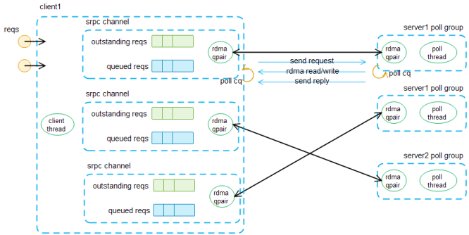 SRPC的架构如图6所示,一个服务端server进程绑定一个port监听连接,server可以设置多个线程作为多个poll group并行处理请求,从请求接收到处理和回调Reply的整个过程都在同一线程内完成;客户端client创建channel连接server,可以指定要连接的server线程,client可以设置多线程,并在创建channel时分配其所在的线程。SRPC同时也支持使用TCP协议兼容未配置专用RDMA网卡的场景。