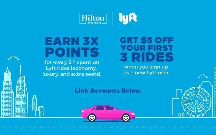 于是Lyft在2019年和希尔顿酒店进行了合作,用户可以将自己的希尔顿会员账户和Lyft账户打通,这时,Lyft用户就可以享受打车3倍积分,拼车2倍积分的福利,而且这一切奖励与之前的Delta SkyMiles福利并不冲突!