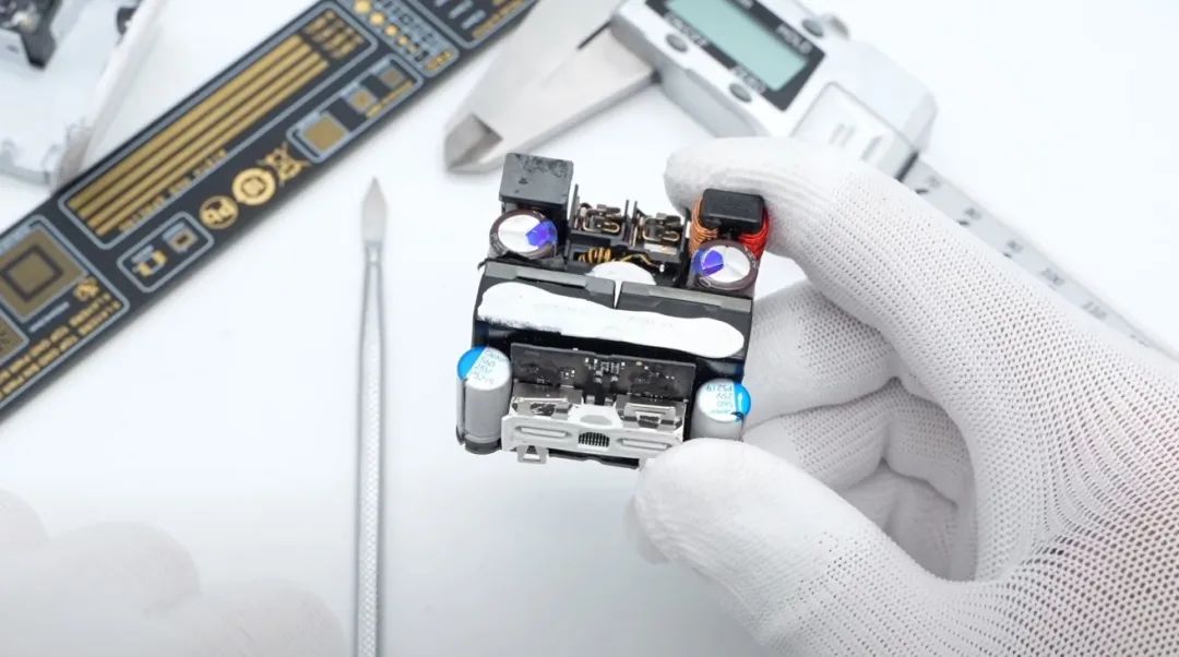 ChargerLab在将其拆解后透露,适配器使用夹子连接印刷电路板模块,以及顶部的定制部分以将其固定到位。散热垫也被隐藏起来,帮助在负载下冷却适配器。