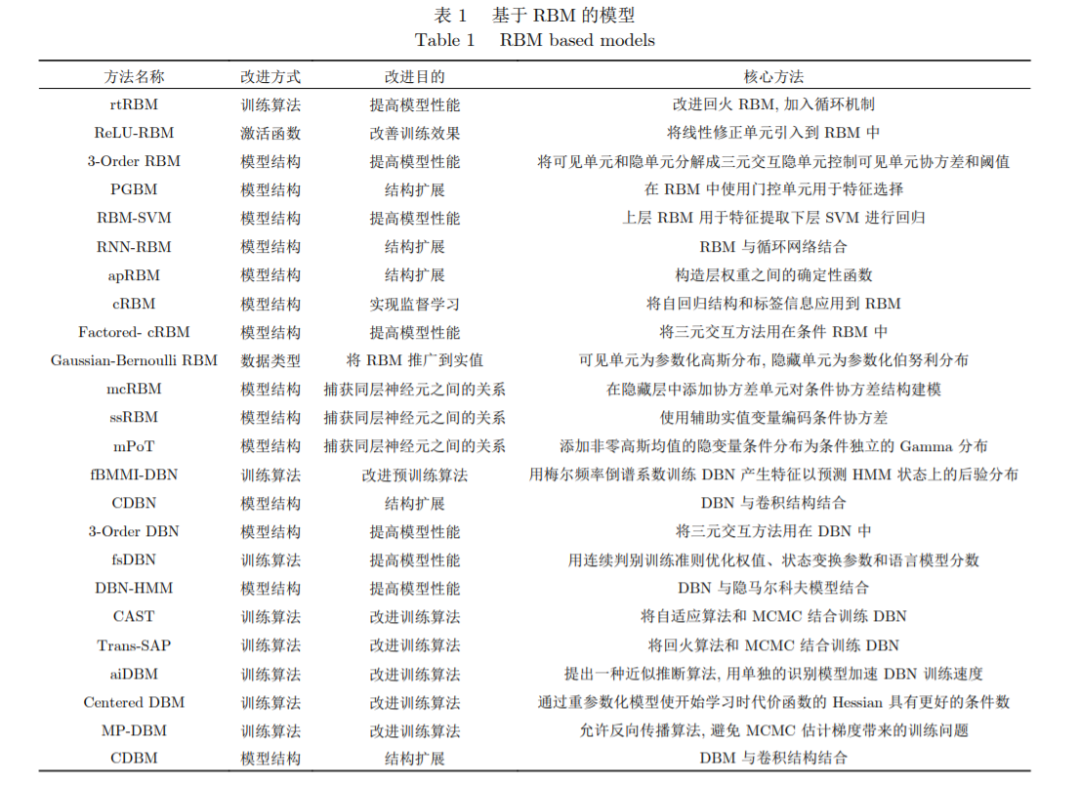 玻尔兹曼机 (Boltzmann machines, BM) 是由 能量函数定义的结构化无向图概率模型, 用于学习 二值向量上的任意概率分布, 广义上把基于能量的 模型都称作 BM. BM 层内各单元之间和各层之间 均为全连接关系, 权值大小表示单元之间的相互作 用关系. BM 变种的流行程度早已超过了该模型本 身, 其中最主要的衍生模型是属于生成模型的受限 玻尔兹曼机[1] (Restricted Boltzmann machines, RBM) 和以 RBM 为基础模块的深度置信网络 (Deep belief network, DBN) 和深度玻尔兹曼机 (Deep Boltzmann machines, DBM) 等深度生成模 型, 是深度学习中的典型代表, 曾受到广泛研究, 国 内外均有关于该模型的综述文章[7−8] . 这类模型能够 学习高维特征和高阶概率依赖关系并成功应用在降 维、特征提取等领域, 是最早出现的深度生成模型. 本节将详细介绍训练过程中存在的问题以及解 决方法; 然后, 以该模型为基础分别介绍 DBN 和 DBM 的结构和相关算法; 最后, 总结近些年来重要 的相关模型和算法改进.