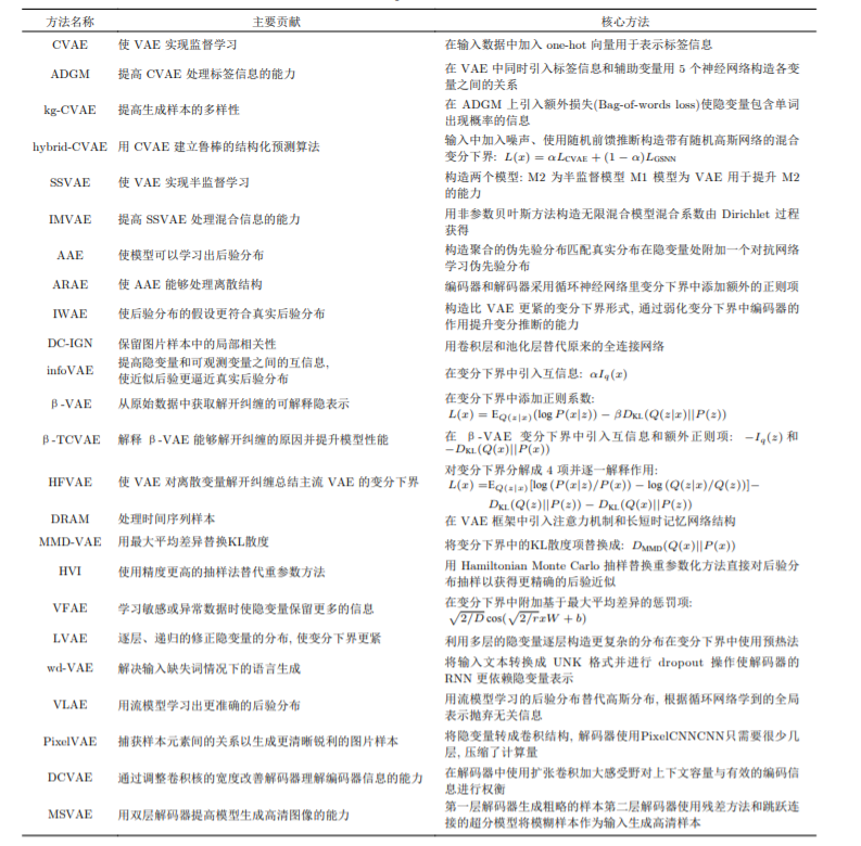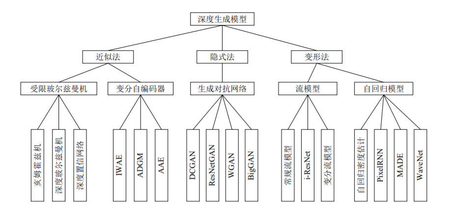 包括深度玻尔兹曼机和深度置信网络两种; 变分自编码器用似然函数的变分下界作为目标函数, 这种使用变分下界替代似然函数的近似方法的效率比受限玻尔兹曼机的抽样方法高很多, 实际效果也更好, 变分自编码器具有代表性的模型包括重要性加权自编码、辅助深度生成模型等.