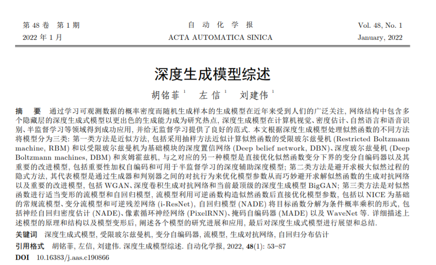 深度生成式模型试图把概率论与数理统计的知 识与强有力的深度神经网络的表示学习能力相结 合, 在最近几年取得了显著进步, 是当前主流的深 度学习方向. 本文对深度生成式模型的主要类型进 行了梳理, 给出了模型的构造过程、优缺点以及模 型存在的问题. 深度生成式模型虽然大有潜力, 但 也存在很多挑战: