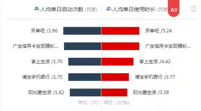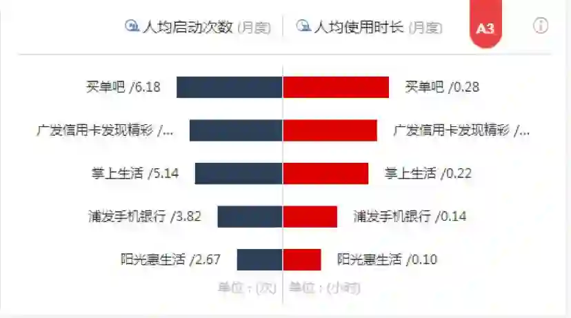 虽然招行的掌上生活在整体月活数据上遥遥领先,但在人均启动次数和人均使用时长,还是就人均单日数据,交通银行的买单吧信用卡服务应用都领先于招商银行的掌上生活。其人均月启动次数达到6.18和0.28小时。在人均单日启动次数上达到了1.96,人均单日使用时长5.24分钟,同样遥遥领先。