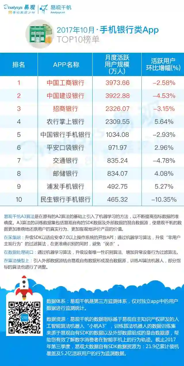 根据易观发布的,2017年10月 手机银行Top10榜单显示,中国四大行(工、农、中、建)占据了前五,中国工商银行以3973.66万月活用户排行第一,紧随其后的是中国建设银行,以3922.88万的月活规模小幅落后中国工商银行。