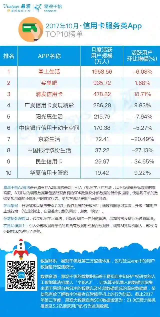 信用卡服务领域,招商银行的“掌上生活”以1958.56万排行第一,也是唯一一家过千万的信用卡应用,交通银行的“买单吧”以935.72万月活居第二名。