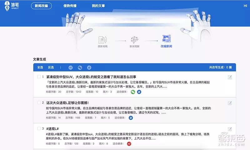 妙笔机器人的改稿过程主要分为三步:第一步,输入原新闻稿标题和内容;第二步,机器对原文进行理解和分析;第三步,选择成稿数量,针对微信、微博和网易新闻的特性,在保证中心内容不变的情况下,改换不同风格的标题和内容,自动插入相关图片、商品链接、名词解释和延伸阅读。