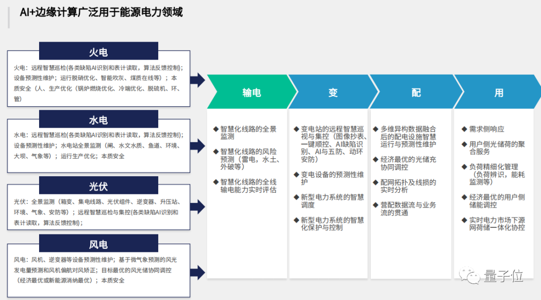 目前AI+边缘计算,从能源电力领域的风光水火的发电侧,到输电变电配电用电的整个场景,应用落地的场景是非常丰富的。