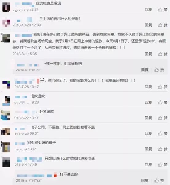 但拉手网最后一条微博下方却没有一条在缅怀这家企业的评论,反而有很多用户在抱怨在拉手网上消费后的余额还没有退到他们手中,直指拉手网是“骗子”。
