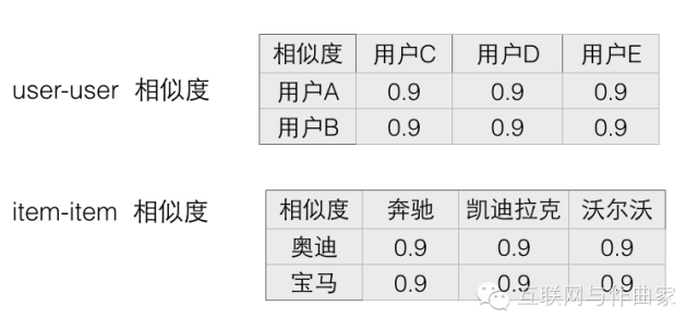 我一直在强调用户行为数据,目的就是为介绍协同过滤算法做铺垫。协同过滤,Collaborative Filtering,简称CF,广泛应用于如今的推荐系统中。通过协同过滤算法,可以算出两个相似度:user-user相似度矩阵; item-item相似度矩阵。
