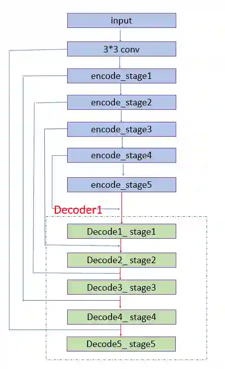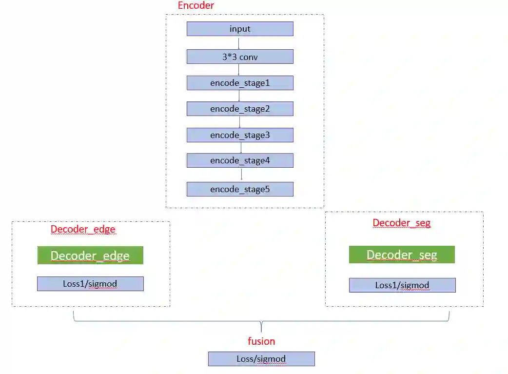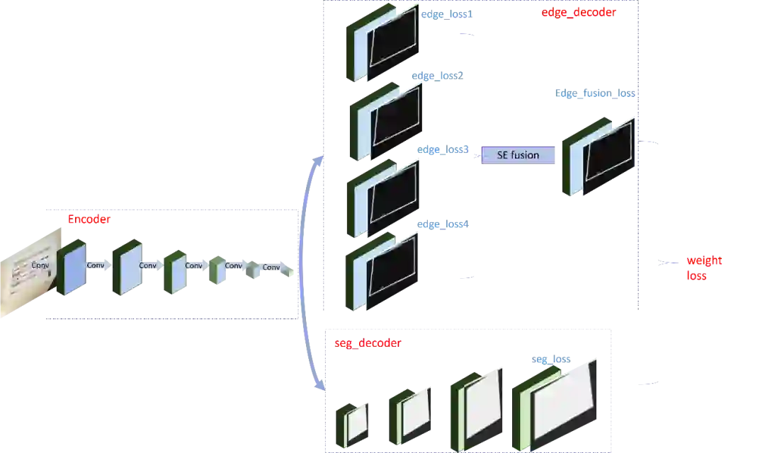 通过 case 分析,我们预测的选框通常会多出背景区域,如果通过语义分析知道大致的文档内容区域,再通过边缘线条检测准确的边框信息,融合信息是否能得到更精确的选框。所以在原有基础上增加了一个分割分支,多任务学习,在 decoder 模块分出两个分支,一个分支学习图像的边缘信息,一个分支学习图像的语义信息,如下图所示。