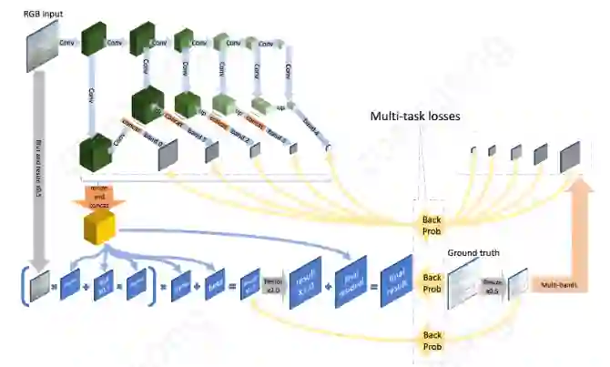 对于屏幕拍摄图片,摩尔纹很影响我们后续处理的图像质量,所以检测到图片后我们首先通过小的分类模型判断是否需要对摩尔纹进行处理,如果属于屏幕拍摄场景会调用去摩尔纹模块。去除摩尔纹的网络框架和效果图如下: