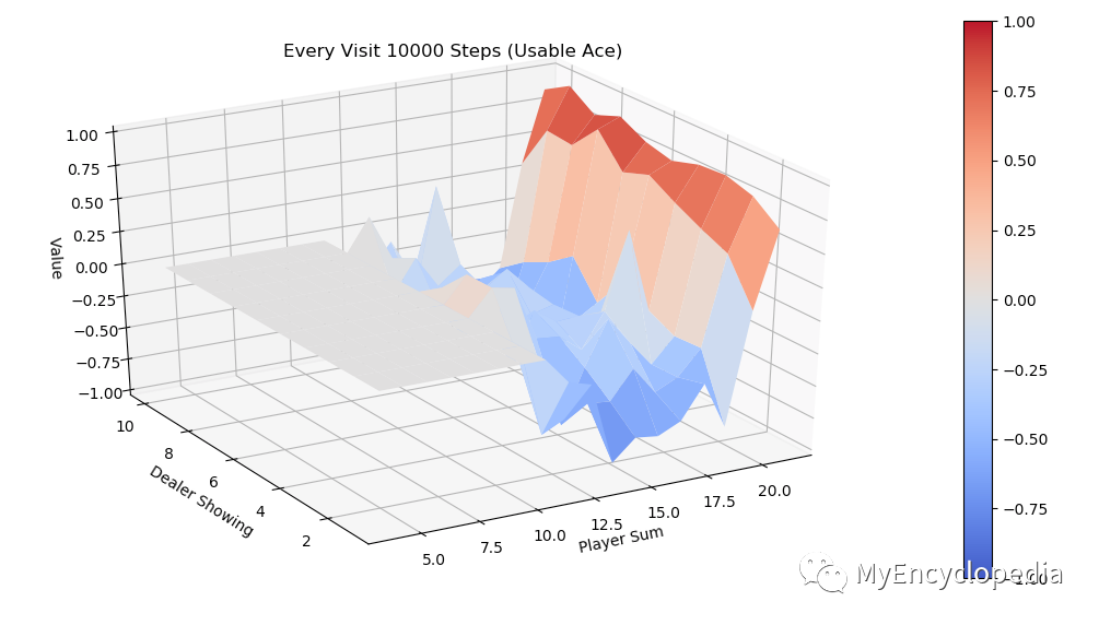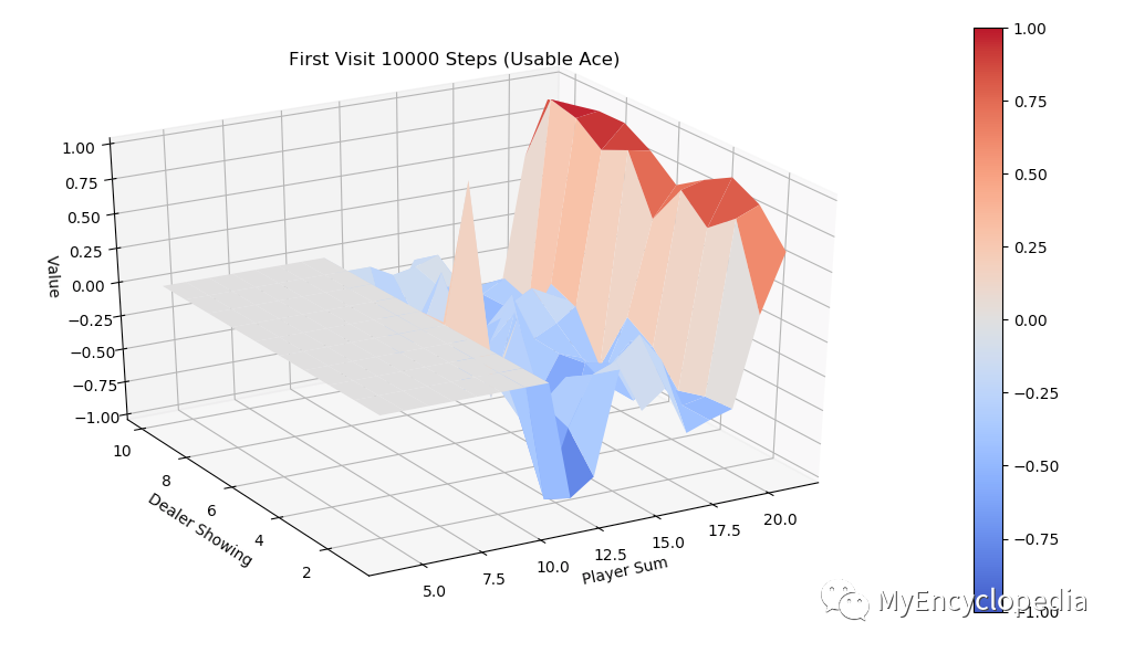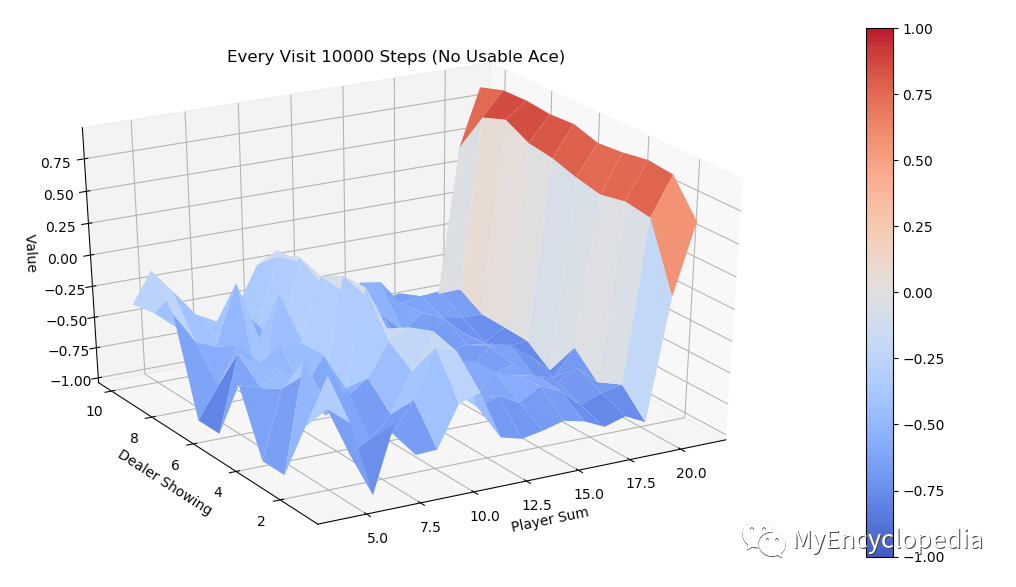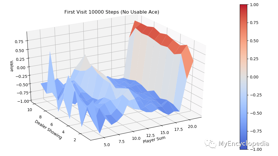 同样运行 every-visit 算法,模拟10000次的 V值 图。对比两种方法结果比较接近。