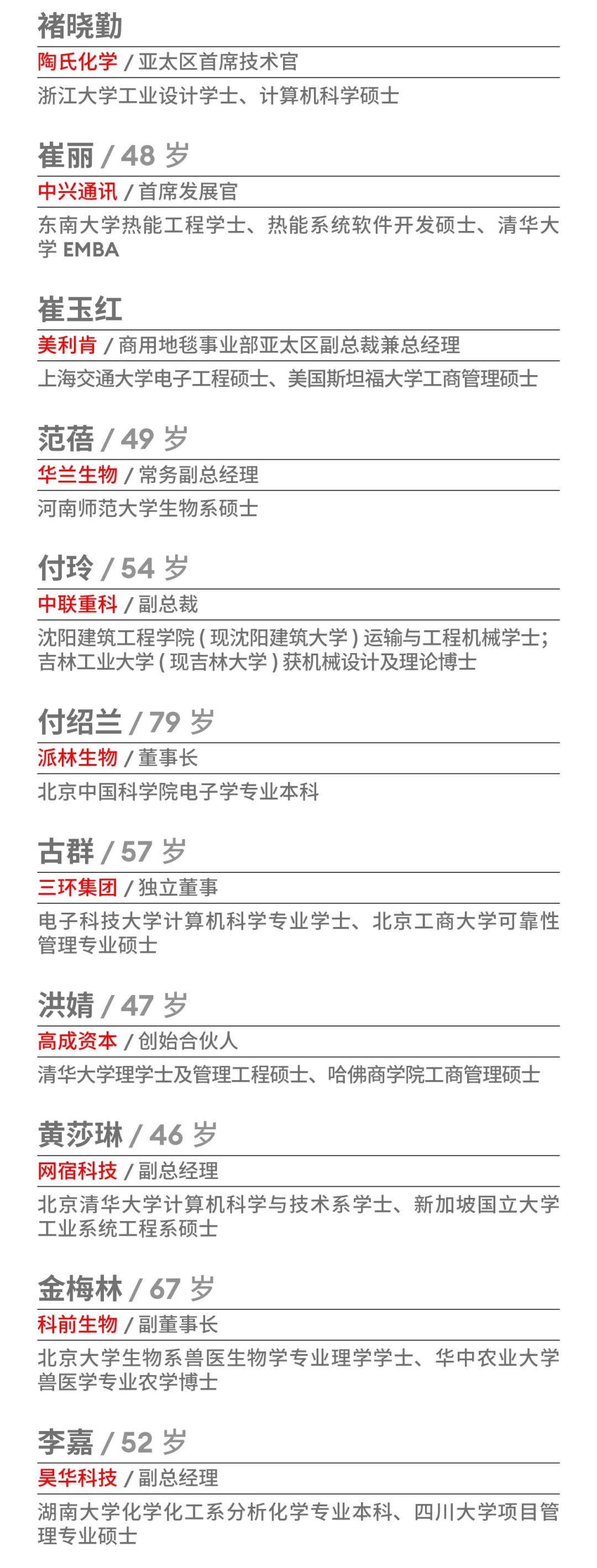 今年,仍有50名中国顶尖科技女性登上该榜单,她们不仅具有强大的企业家精神和深厚的科技背景,还善于运用女性独特的细腻和坚韧,给科技界带来了别样的风景和创新视角。