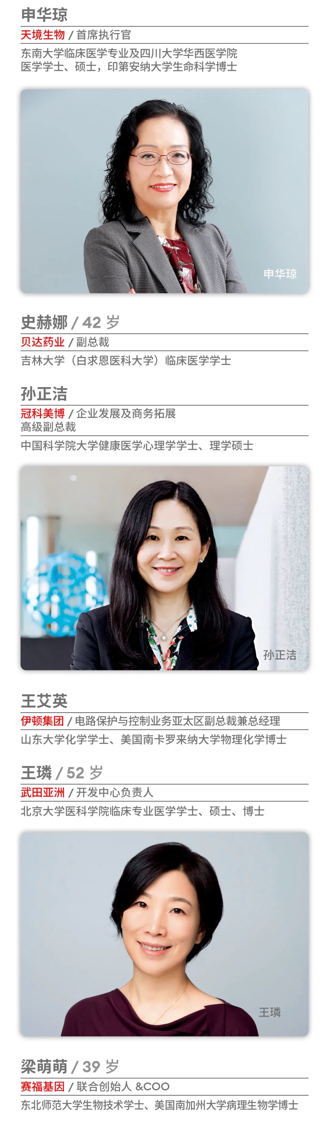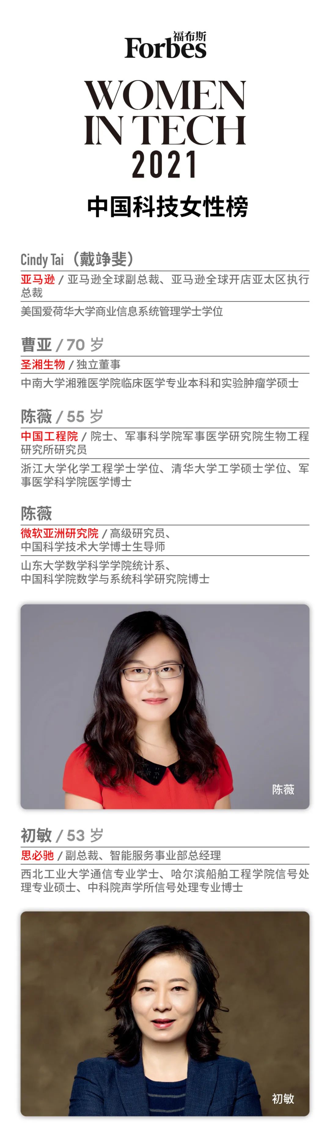2021 年,福布斯中国连续第三年推出 “中国科技女性榜”,致敬活跃在中国的硬核女性。从左至右分别为:上海交通大学医学遗传研究所所长曾凡一;思必驰副总裁、智能服务事业部总经理初敏;小马智行副总裁、广州研发中心负责人莫璐怡;亚马逊全球副总裁、亚马逊全球开店亚太区执行总裁戴竫斐;微软亚洲研究院高级研究员、中国科学技术大学博士生导师陈薇;欧莱雅大中华区首席信息技术官赵枫。