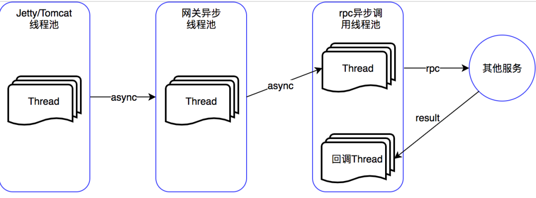 先在 Web 容器中开启 Servlet 异步,然后进入到网关的业务线程池中进行业务处理,然后进行 RPC 的异步调用并注册需要回调的业务,最后在回调线程池中进行回调处理。