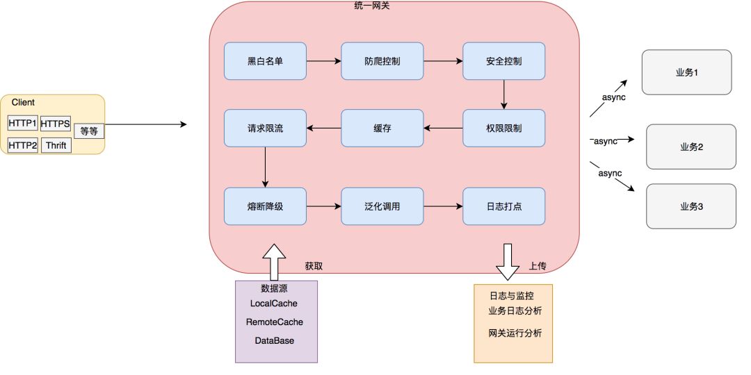 对于我们统一的网关层,如何用少量的机器接入更多的服务,这就需要我们的异步,用来提高更多的吞吐量。