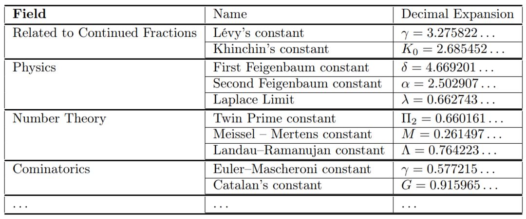 表 2:来自不同领域的基本常数示例,这些都是本文方法的相关目标。