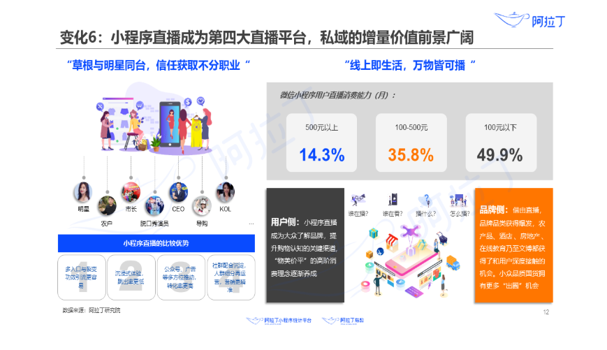 小程序直播和其他直播平台相比,最大差异点在于小程序直播更加适合基于商家私域的开展,结合社交关系链的影响,小程序直播的成交单价会更高,即使在直播结束后也可以通过优惠券等方式对用户进行持续激活、召回、转化、成交。
