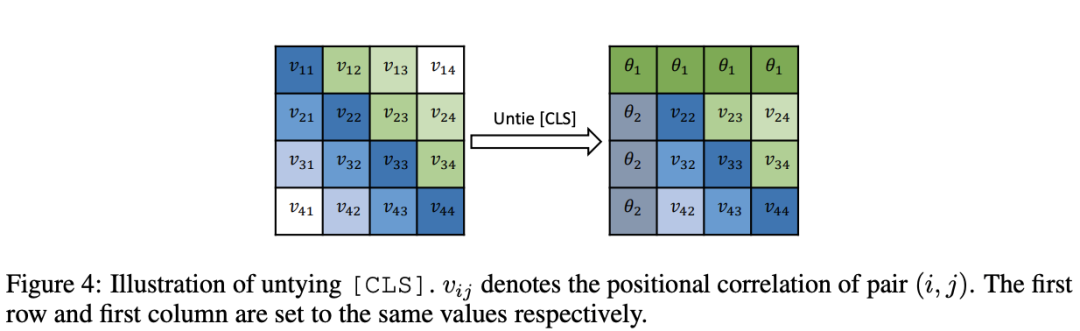 为了将[CLS]符号从其他位置解开,建议重置与[CLS]相对应的位置相关性。为了更好地演示,将 表示为位置i和j之间的无内容(仅位置)相关性。