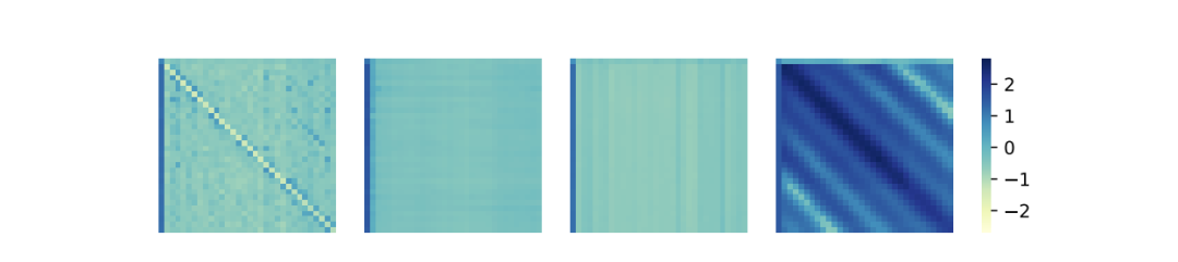 我们对展开后的四项做了可视化。如下图所示,可以看到中间两项看起来很均匀,说明position 和 token 之间确实没有太强的关联;token 和 position 用了相同的矩阵做 QKV 的变换。但 position 和 token 所包含的信息不一样,共享矩阵也不合理。