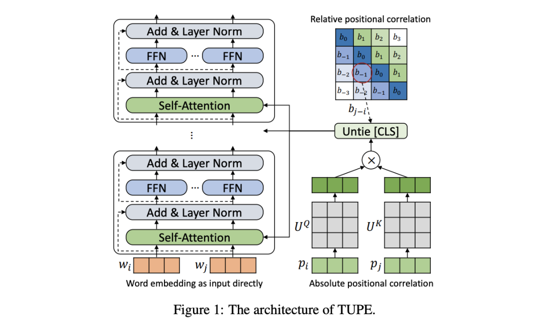 其次,TUPE使用一个不同的函数来计算[CLS]符号和其他位置之间的相关性。这种灵活性可以帮助模型学习整个句子的准确表示。下面具体介绍TUPE模型。