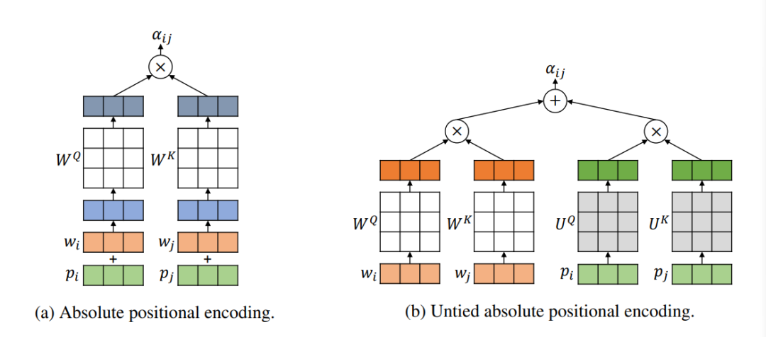 其中, 是把 positional embedding 映射到 Q 和 K 所用的矩阵, 用于维持 的量纲。与相对位置编码相结合,只需将上式改变为