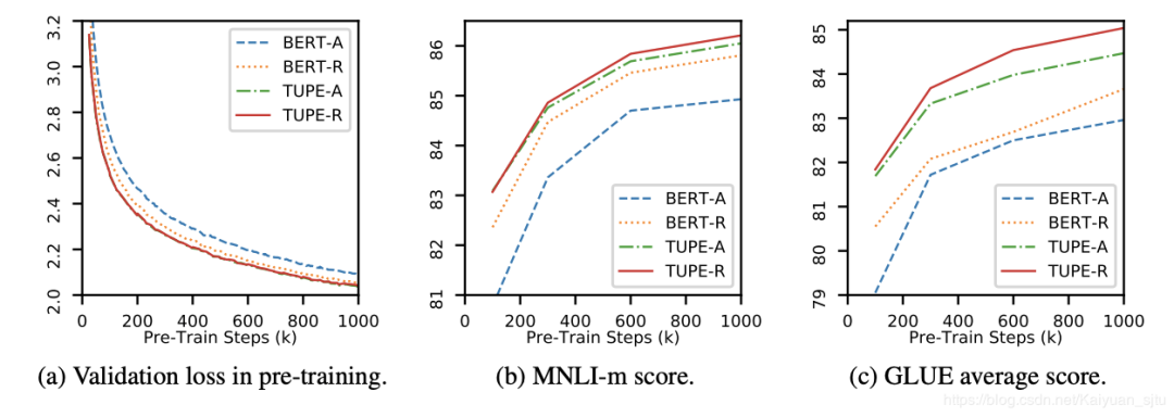首先,如下(b)图我们可以看到在TUPE中,位置相关性和单词相关性分别在self-attention模块中计算,然后相加。该设计成功地消除了词语和位置之间的关联。