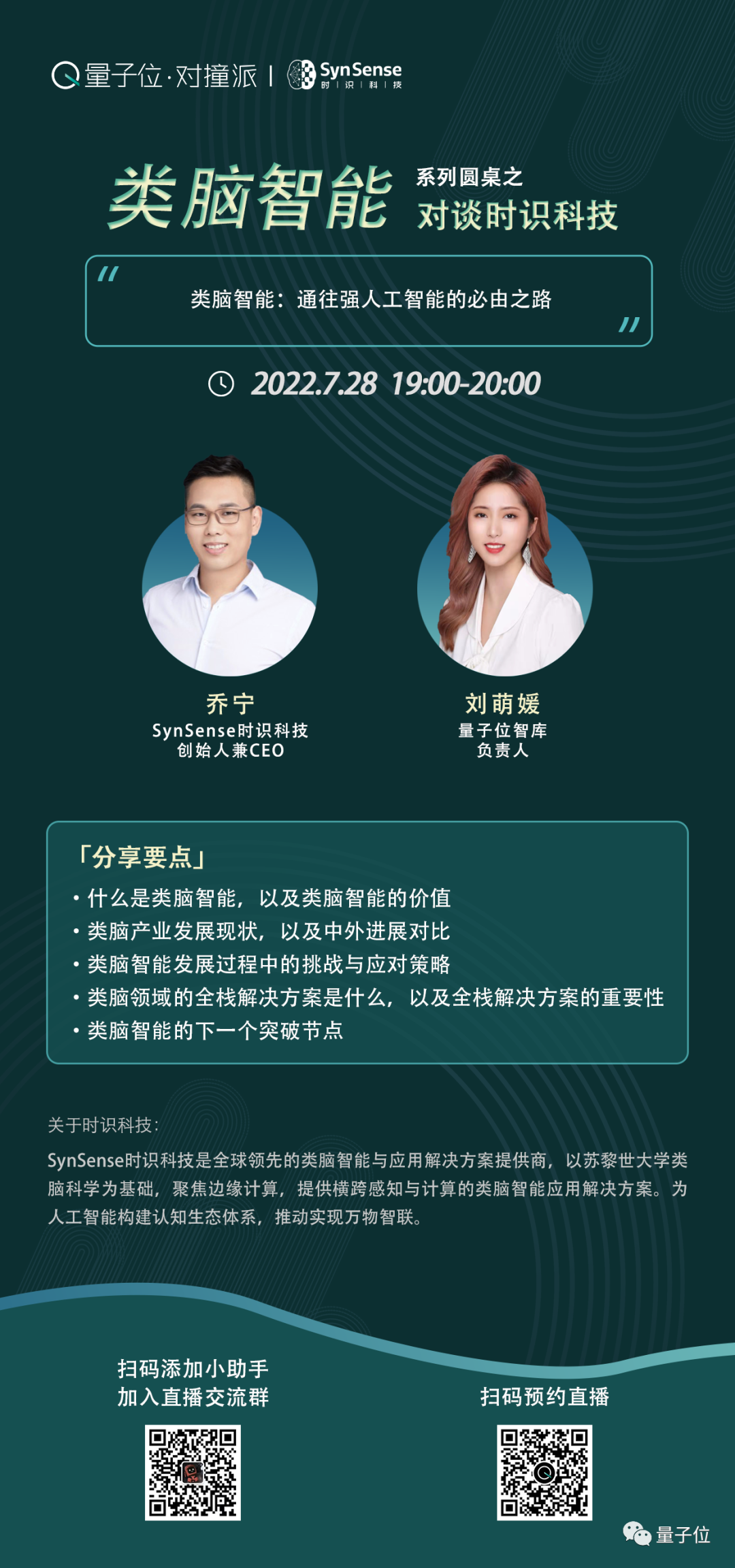 7月28日晚19:00,“类脑智能”系列对谈节目第一期「量子位·对撞派」邀请到了全球领先的类脑智能企业——时识科技,将由时识科技的创始人兼CEO乔宁博士为我们分享~