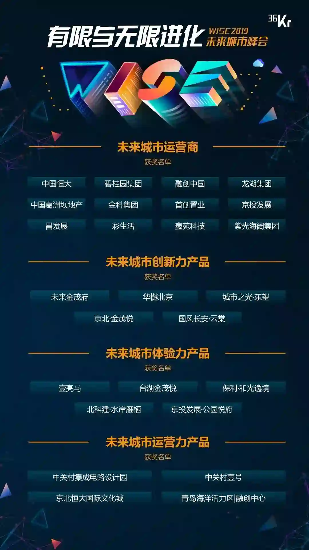 WISE2019 未来城市峰会奖项及获奖单位如下: