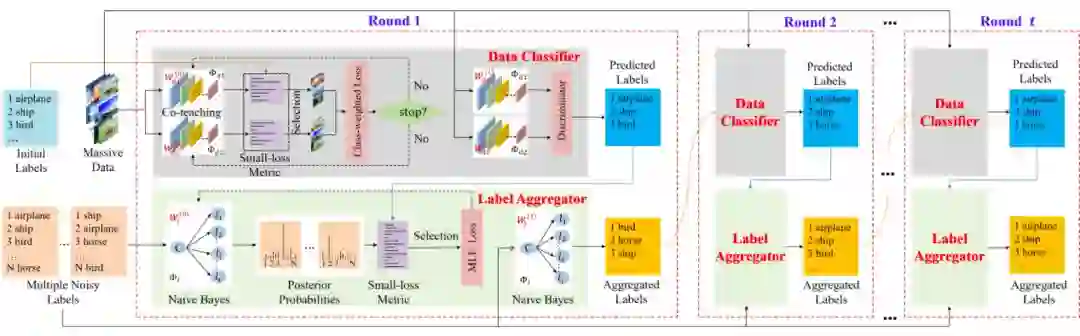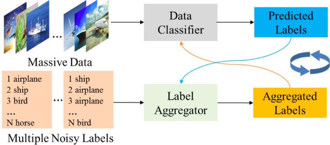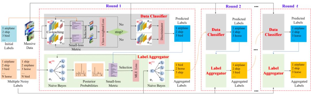 在经过初始化和预训练后,这一问题可以在交替更新的预测标签和聚集标签的监督下,通过替代优化解决。这种双视图视角提供了一种简单而通用的方式,使标签聚合器和数据分类器彼此交换知识。