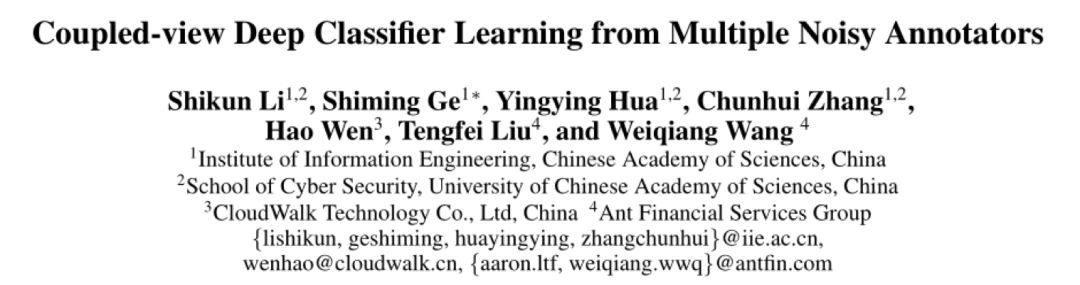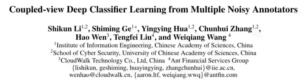 云从科技与中科院信工所发表《Coupled-view DeepClassififier Learning from Multiple Noisy Annotators》,探索能够有效地利用多个弱标签的信息进行深度学习分类的方法,提出了一种从多人标注的带噪标签中进行双视图深度分类器学习的新方法。