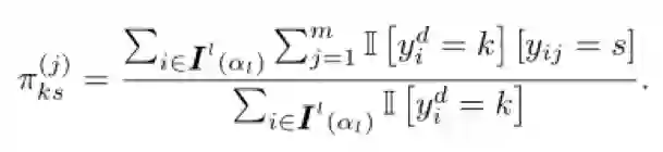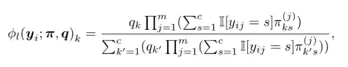 假设每个标注者的标签噪声都是随机且独立的情况下,我们采用了一种以噪声混淆矩阵为学习参数的朴素贝叶斯分类器。在噪声混淆矩阵π和类别先验分布q不变的情况下,第 i 个样本的第 k 类的后验概率可以用下式计算: