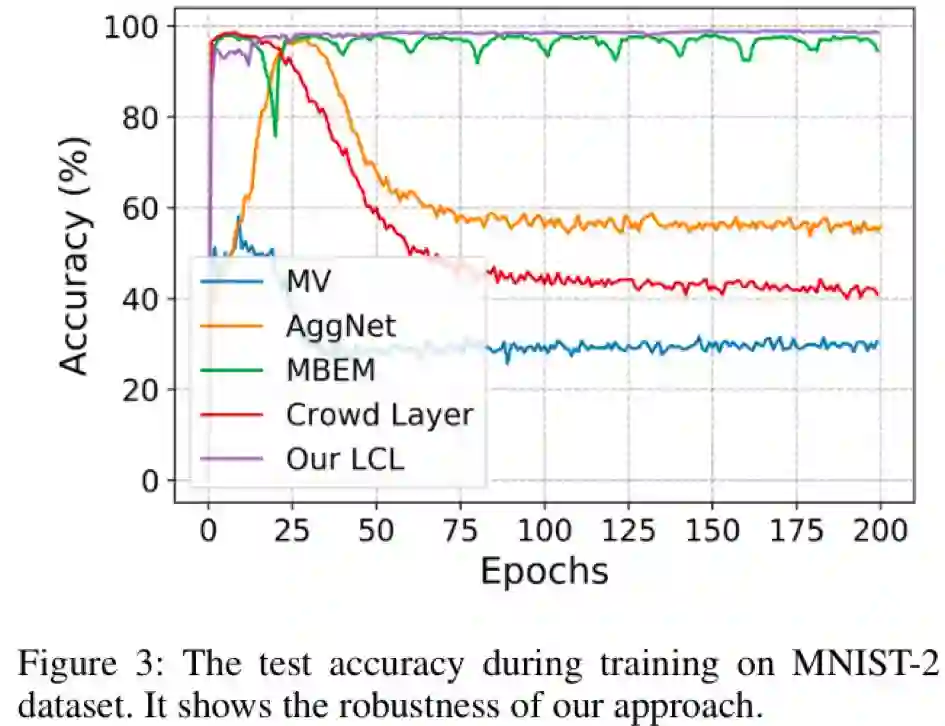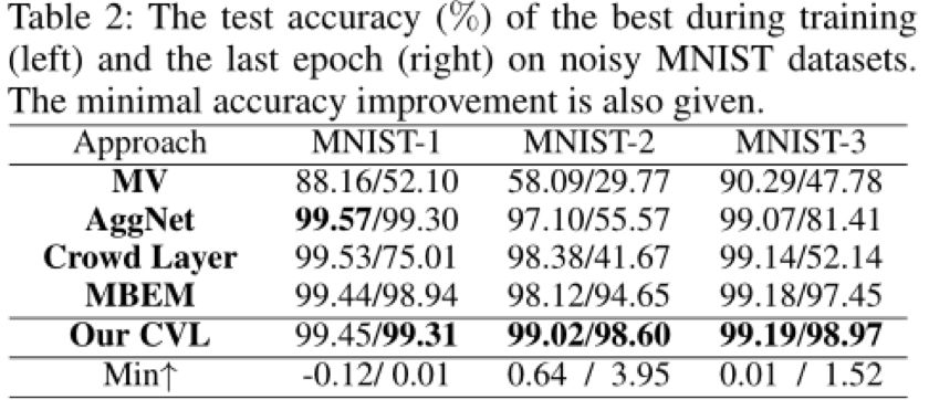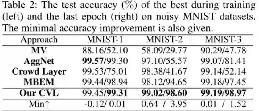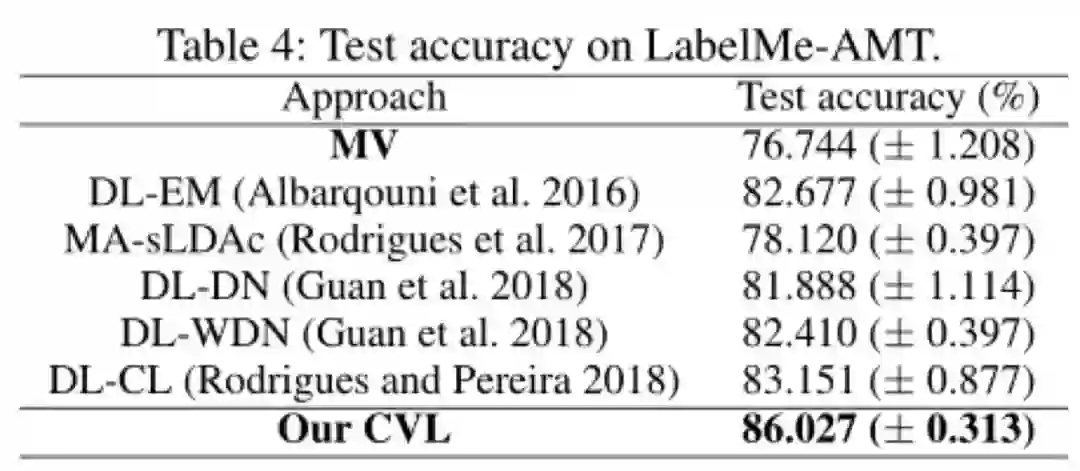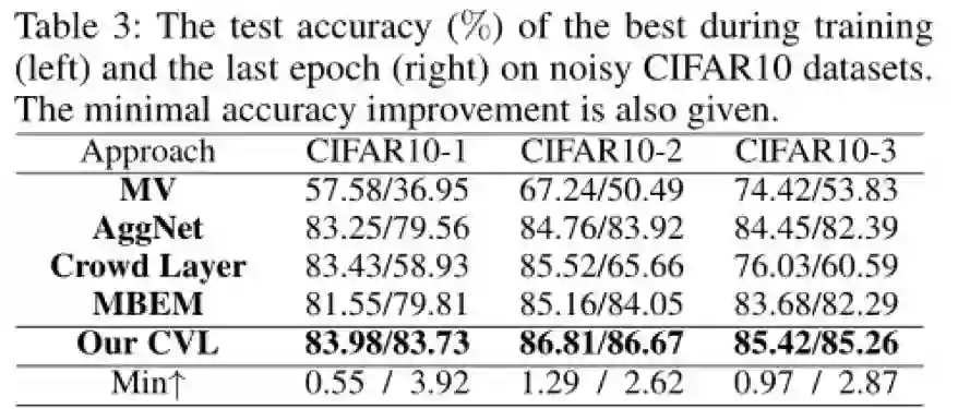 在两个合成数据集(MNIST和CIFAR10)和一个真实数据集(LabelMe-AMT)中进行实验,最后对比结果显示,CVL方法在有效性、鲁棒性、稳定性等方面均优于其他算法。